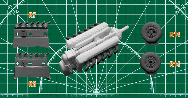 Набор для сборки модели истребителя «Спитфайр» в масштабе 1:48 состоит из пластиковых деталей и суперкопийных деталей из смолы (выхлопные патрубки и колёса).