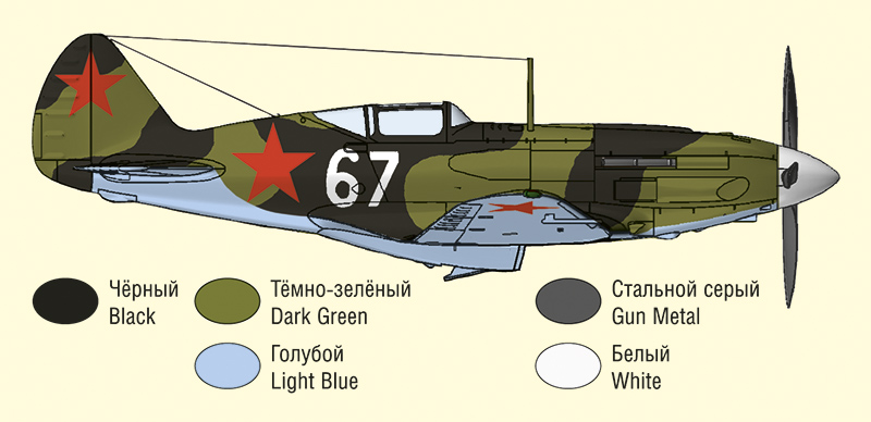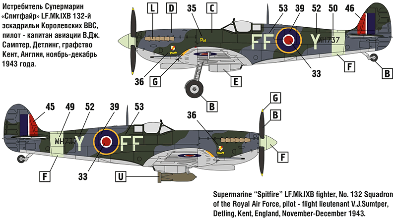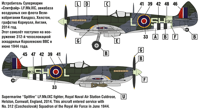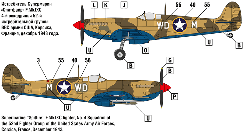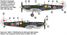 Британский самолёт Супермарин «Спитфайр» - один из самых известных, красивых и лучших истребителей Второй мировой войны. Модификация «Спитфайр» Mk.IX была создана в 1942 году и предназначалась для борьбы с новейшими немецкими истребителями Фокке-Вульф Fw 190 A. Самолёт «Спитфайр» Mk.IX был надёжным и простым в эксплуатации, обладал отличными лётными характеристиками, был хорошо вооружён и бронирован. Эта модификация применялась в качестве истребителей малых (LF), средних (F), больших (HF) высот и истребителей-бомбардировщиков. Самолёты «Спитфайр» Mk.IX состояли на вооружении ВВС Великобритании, США, СССР, Австралии, Канады, Франции и многих других стран. Всего за период с конца 1942 по 1945 год было произведено 5 710 самолётов Супермарин «Спитфайр» Mk.IX.
